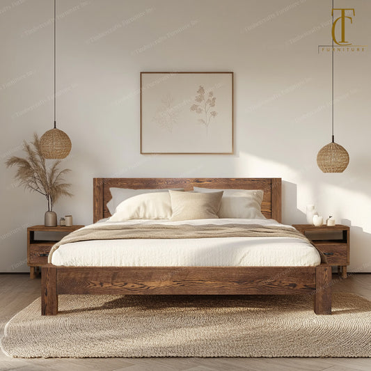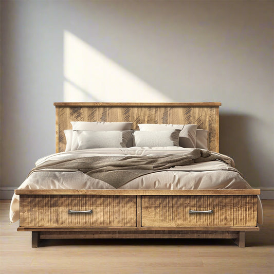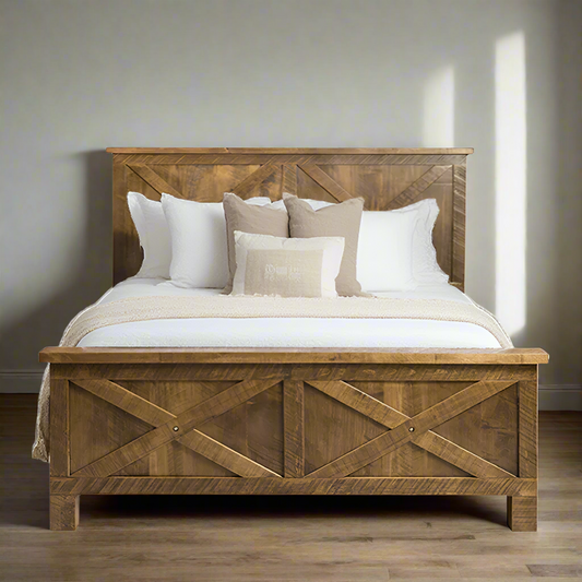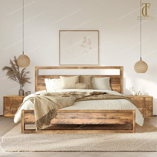 The Timbercrafts bed collection, meticulously crafted by Mennonite artisans in Canada, utilizes solid wormy maple wood to create each unique piece. Every bed highlights the natural beauty of the wood, showcasing distinctive saw marks and grain patterns that ensure that no two pieces are alike, resulting in a truly exceptional addition to any bedroom.